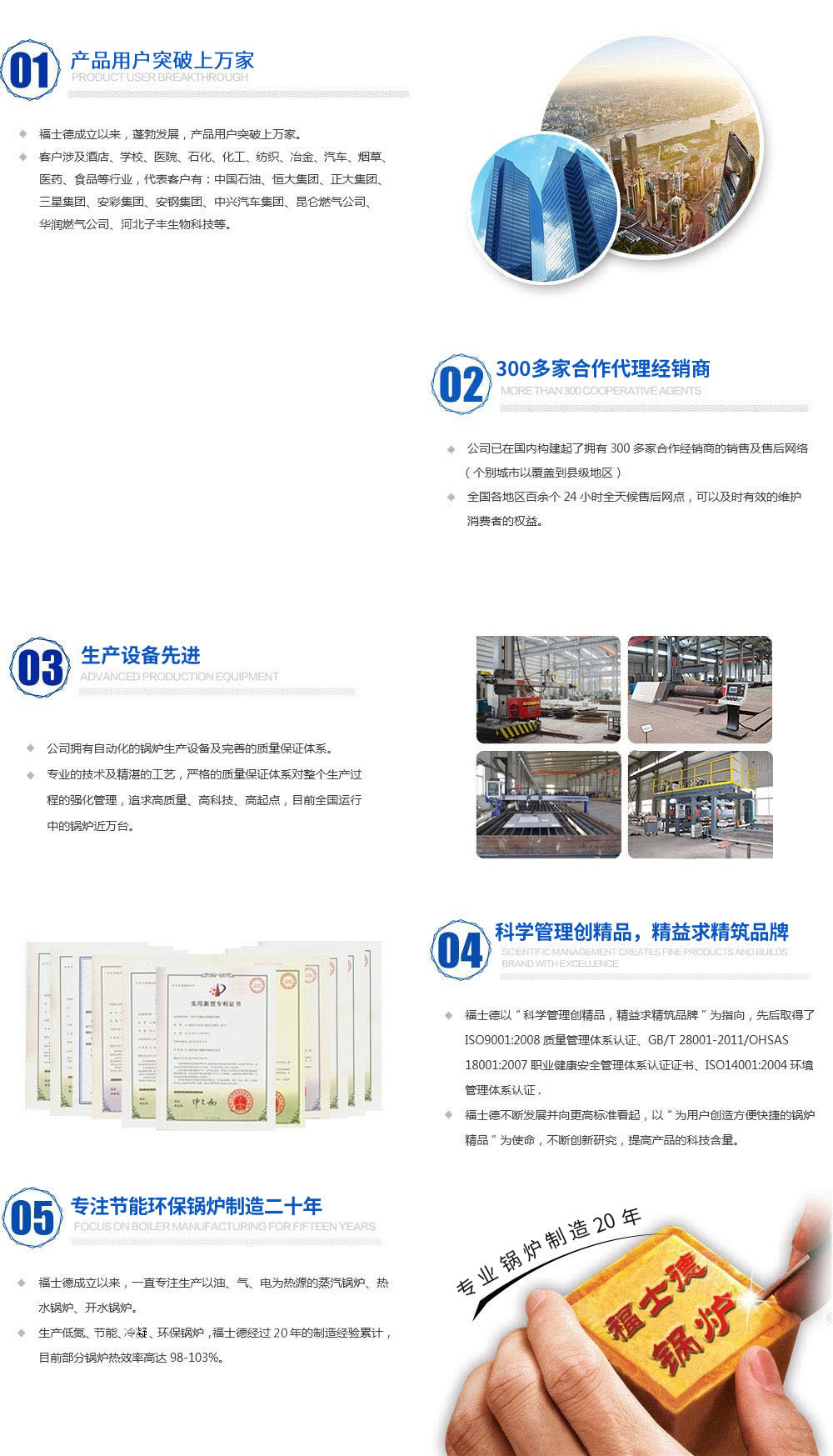 福士德成立以來(lái),一直專(zhuān)注生產(chǎn)以油、氣、電為熱源的蒸汽鍋爐、熱水鍋爐、開(kāi)水鍋爐,生產(chǎn)低氮、節(jié)能、高效、環(huán)保鍋爐,福士德經(jīng)過(guò)15年的制造經(jīng)驗(yàn)累計(jì),目前部分鍋爐熱效率高達(dá)98-103%。擁有自動(dòng)化的鍋爐生產(chǎn)設(shè)備及完善的質(zhì)量保證體系,專(zhuān)業(yè)的技術(shù)及精湛的工藝,嚴(yán)格的質(zhì)量保證體系對(duì)整個(gè)生產(chǎn)過(guò)程的強(qiáng)化管理,追求高質(zhì)量、高科技、高起點(diǎn),目前全國(guó)運(yùn)行中的鍋爐近萬(wàn)臺(tái),客戶(hù)涉及酒店、學(xué)校、醫(yī)院、石化、化工、紡織、冶金、汽車(chē)、煙草、醫(yī)藥、食品等行業(yè),代表客戶(hù)有:中國(guó)石油、恒大集團(tuán)、正大集團(tuán)、三星集團(tuán)、安彩集團(tuán)、安鋼集團(tuán)、中興汽車(chē)集團(tuán)、昆侖燃?xì)夤尽⑷A潤(rùn)燃?xì)夤?、河北子豐生物科技......